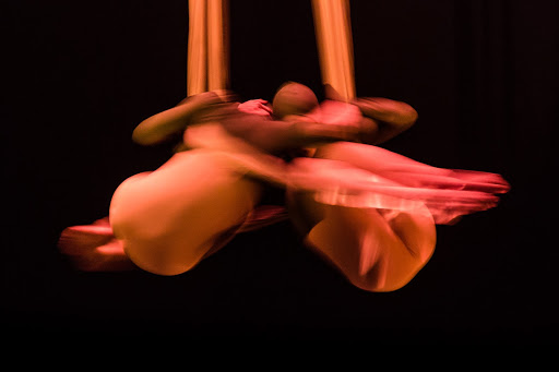 Uma vez colocado nosso desejo de explorar os tecidos em suas mais variadas possibilidades, estabelecemos também que queríamos todos os equipamentos em cena, preenchendo o espaço cênico em sua totalidade. E isso se daria de modo descentralizado, ou seja, não queríamos o corpo em cena pendurado, no centro do palco. Ainda sobre as relações do espaço cênico e os equipamentos aéreos, algo muito presente no universo circense são as contrarregragens entre uma cena e outra. Sobre isso, desejávamos que esses momentos não representassem rupturas, mas diferentemente, que compusessem a cenografia progressivamente, acumulando elementos cênicos no palco, e ao final do espetáculo, o pública contempla uma cenografia composta por todos os equipamentos aéreos e pelos bailarinos. Por fim, e ainda sobre a ideia de descentralizar, ressaltamos que ao conceber as cenas, não partimos do princípio que o foco estaria no corpo em movimento, mas diferentemente, na relação poética que este corpo em movimento estabelece com os aparelhos aéreos.